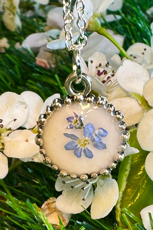 Tiny Pendant with White Background and Blue "Forget Me Not"