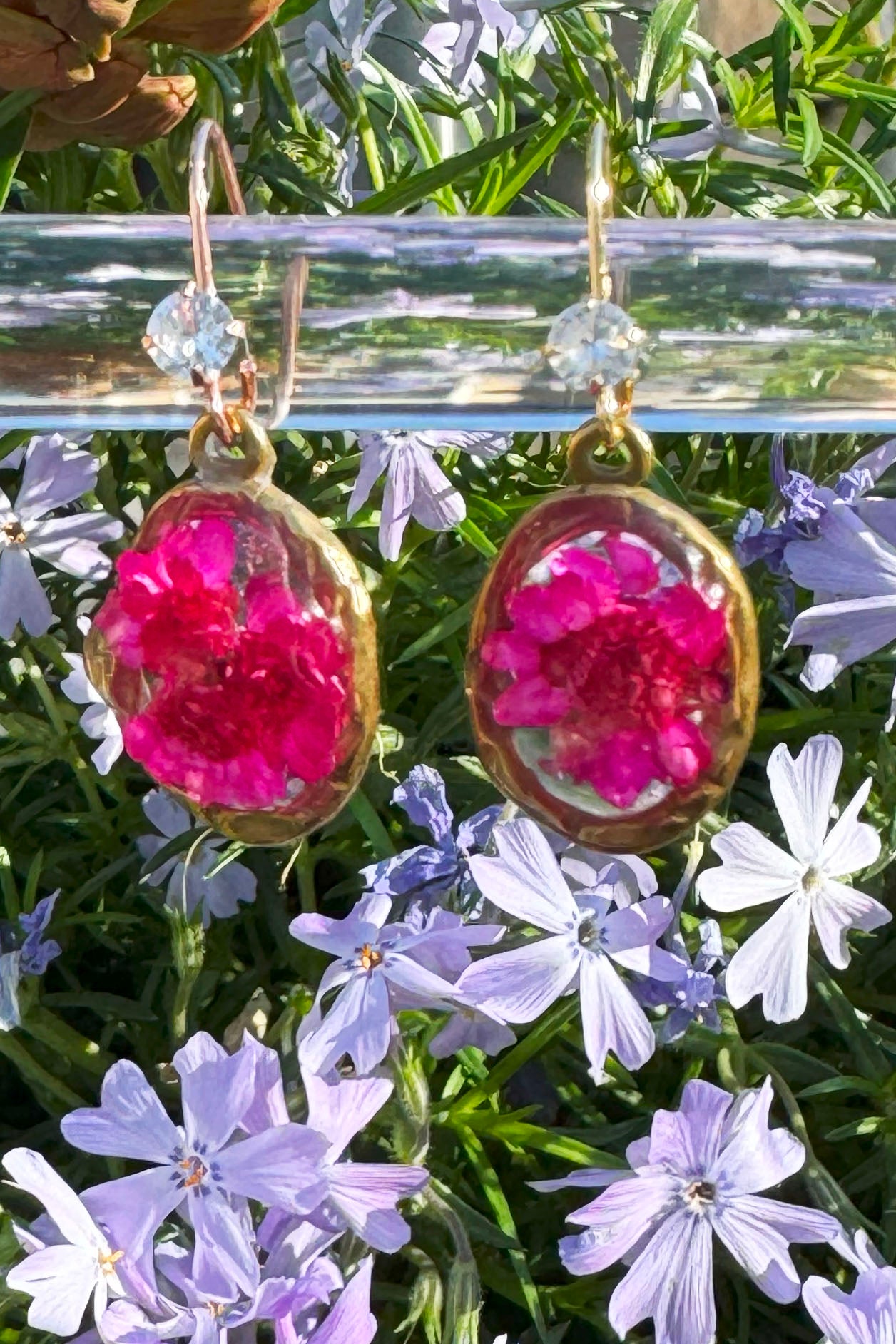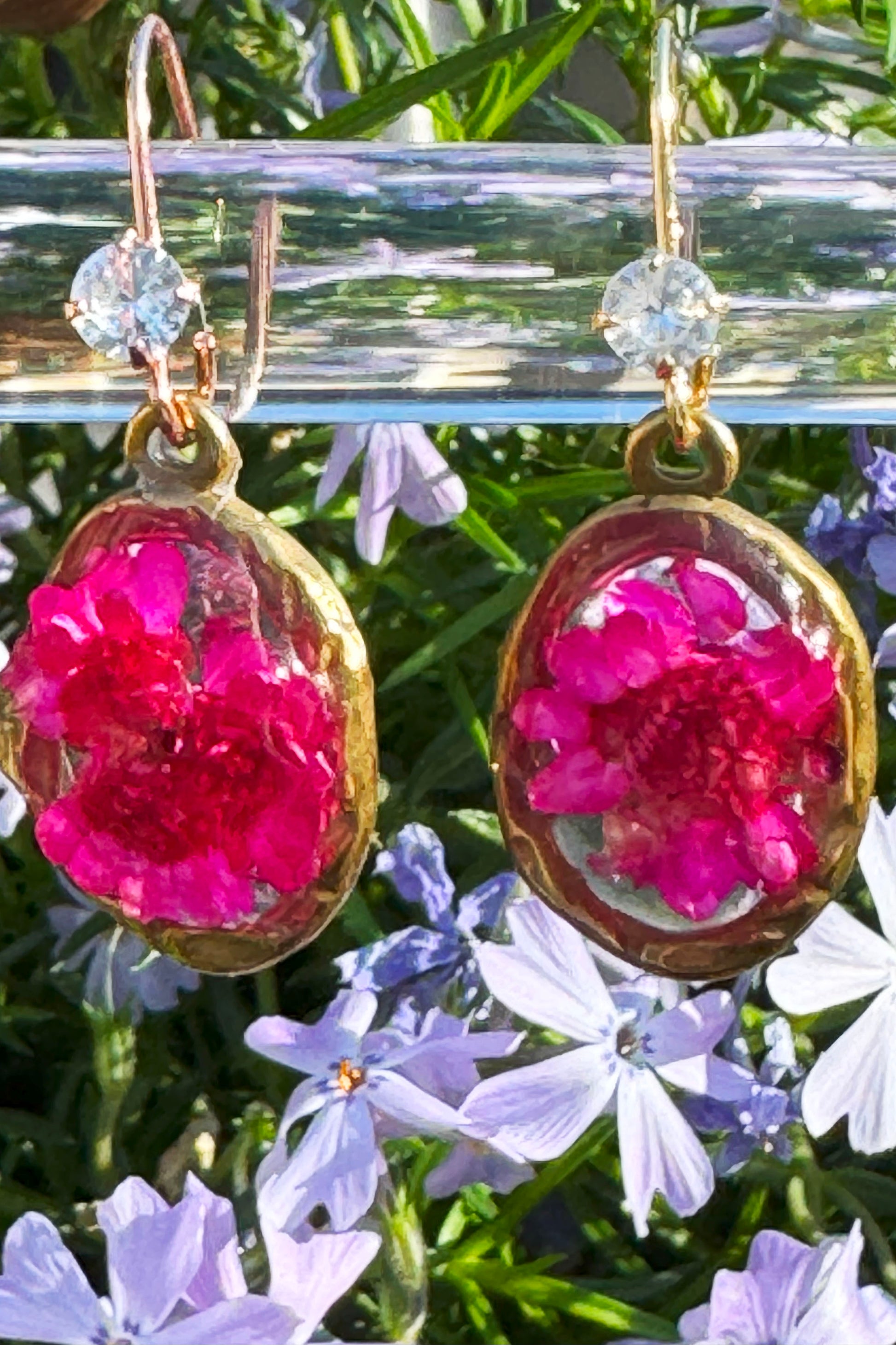 Earrings Dark Pink Flowers in Gold Setting