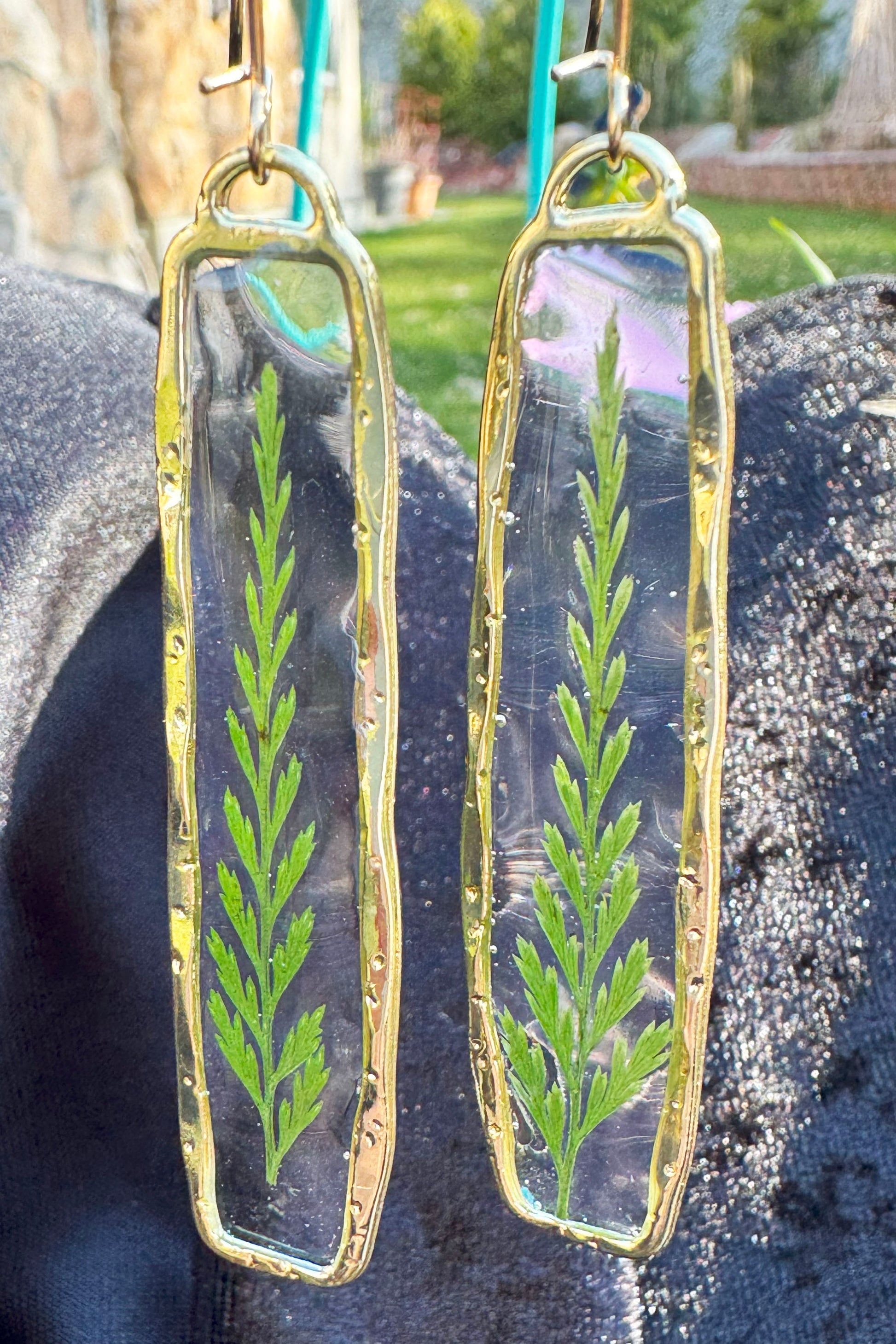 Discover the beauty of nature with our Long Dangle Fern Earrings. Made with real ferns, these earrings exude a sense of earthiness and elegance. Add a touch of bohemian charm to your outfit and showcase your love for the outdoors. Perfect for any occasion.