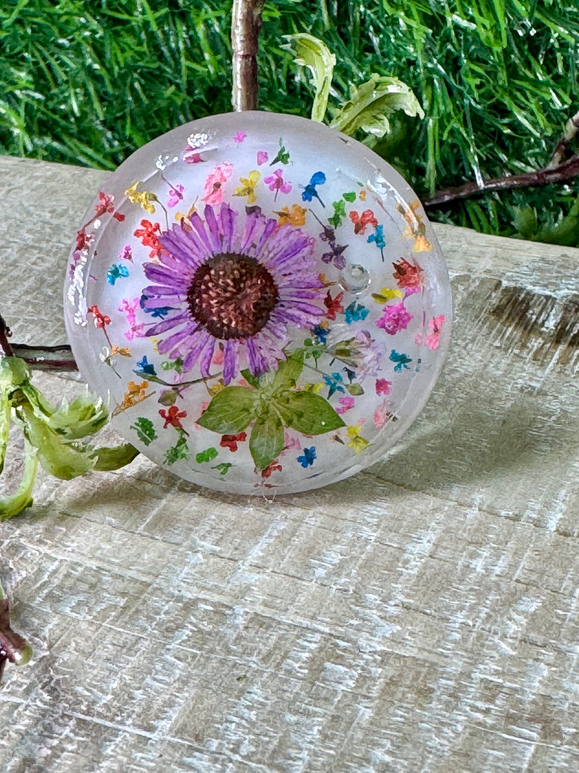 This Lavender Daisy Pendant features tiny colored petals in a beautiful, cheerful design, making it a colorful show stopper. With its delicate floral details, it adds a touch of joy and vibrancy to any outfit. Wearing this pendant will certainly make you stand out and brighten up your day.