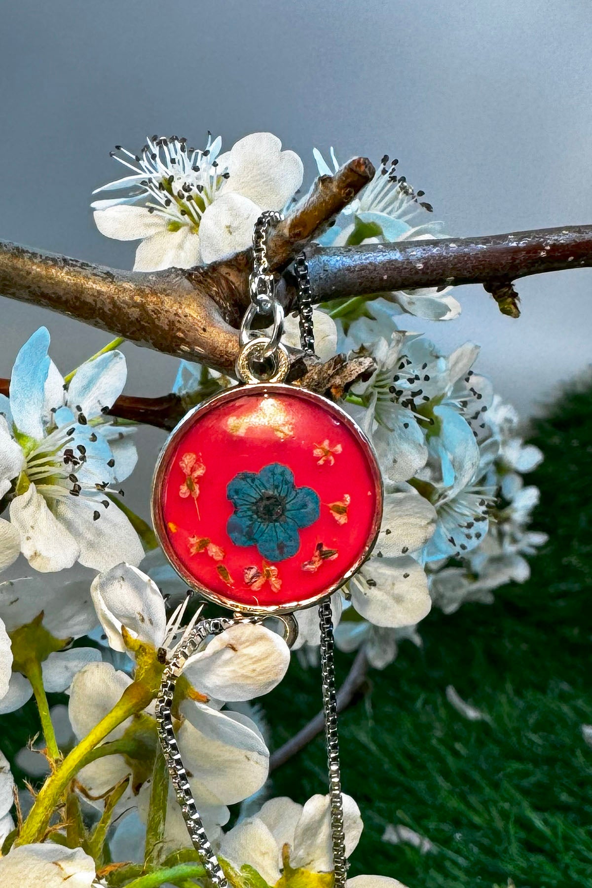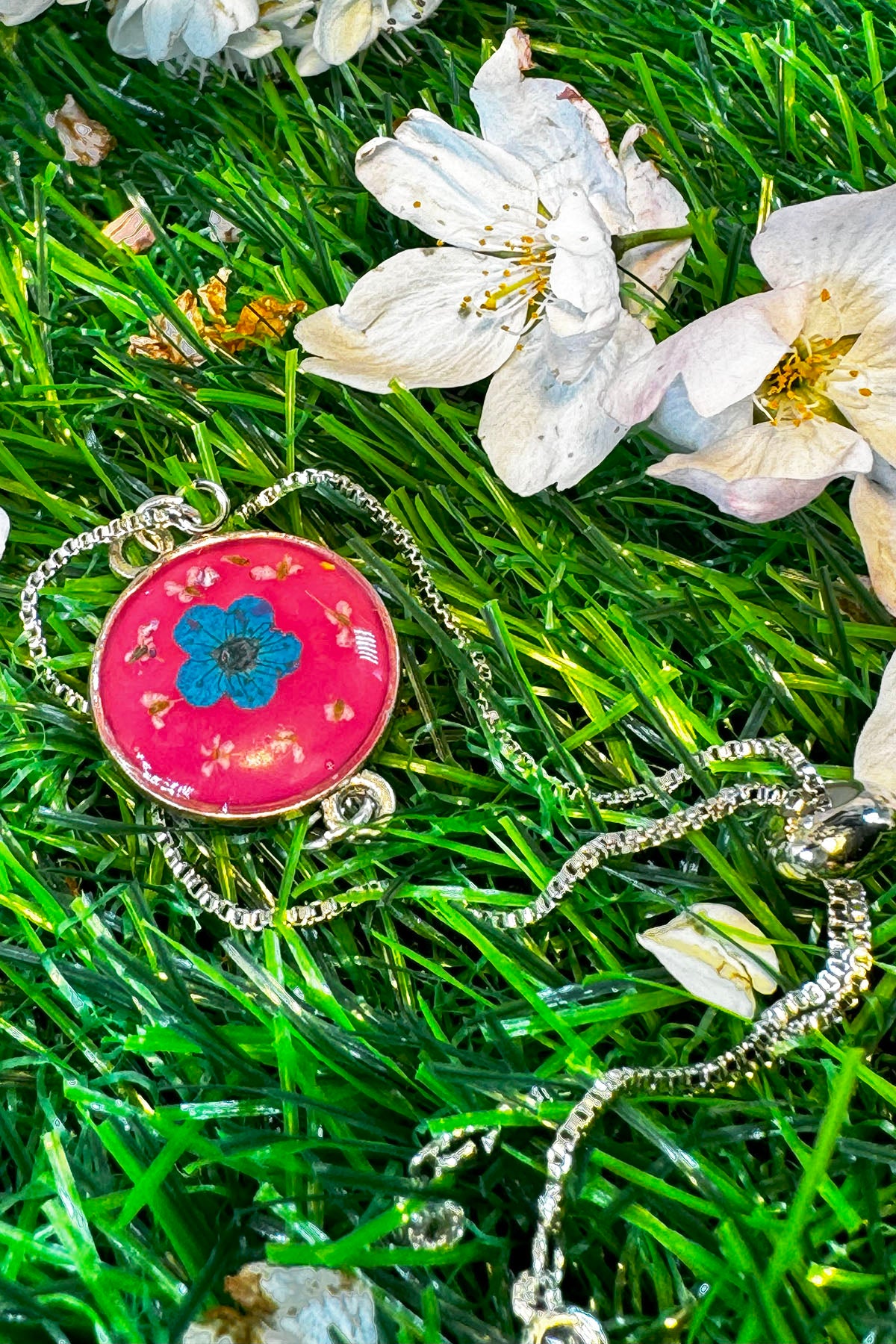 Red Bracelet with a Blue " Forget Me Not" in Silver