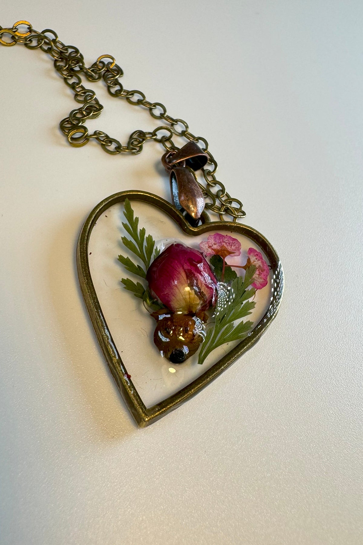 This Rose Heart Pendant in Antique Bronze showcases a real rose bud and boasts a 3D design for a unique and captivating look. The secure resin ensures long-lasting beauty. Elevate your style with this stunning and timeless piece.